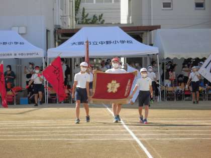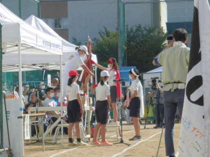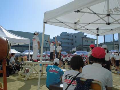 開会式です。スローガン発表やハッスルポイント、優勝旗・淳優勝盾返還など児童会・応援団の子どもたちが頑張りました。