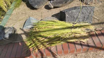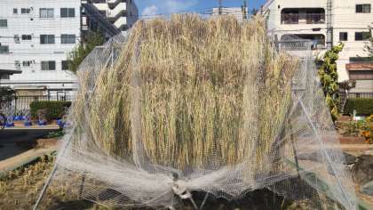 刈り取った稲を縄で縛ってまとめました。その後、まとめた稲を干して、いつも雀に食べられてしまうので、網をかけました。