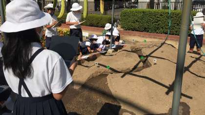 学習園の雑草をみんなで抜いて、スコップで土の山をつくり、