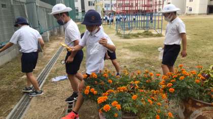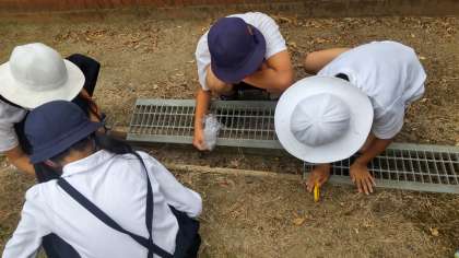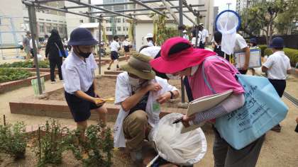 今日は、はる・なつに続いてあきの生き物探しでした。2回目なのでグループで役割分担して学校にいる生き物を探しました。環境局から依頼されたゲストティーチャーの方に生き物を見つけるたびに生き物の名前を確認していました。