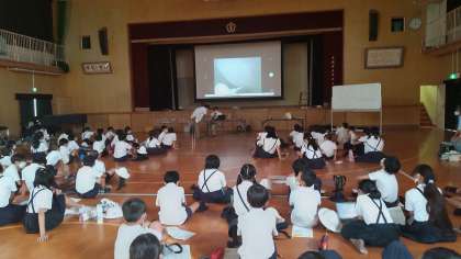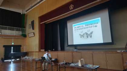 最後に講堂で見つけた生き物をみんなで交流しました。生き物が一番たくさんいた場所は芝生で46種類、全部で中野小学校には、125種類の生き物がいることが分かりました。また、春・夏と秋の生き物の違いをアゲハを例にして教えていただきました。大きさや色などが違うことが分かりました。