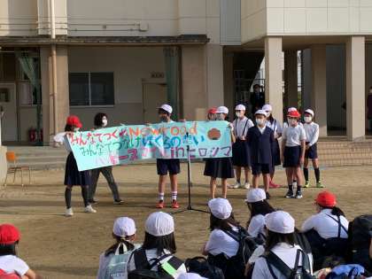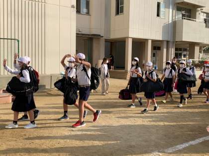 お天気の心配をしていましたが、朝集合したら晴れてきました。出発式を行いました。スローガンの発表です。「みんなでつくれ New road みんなでつなげ ぼくらの想い ハッピースマイル in ヒロシマ」今年から行く広島に新しい道を後輩につなぎ、平和の学習はもちろんのこと、友だちとの絆を深め、笑顔いっぱいハッピー気分で過ごせるようという思いが込められています。みんな元気で「行ってきまーす」
