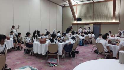 夕食は円卓で班ごとにいただきました。たくさんあって食べ切れたかな?