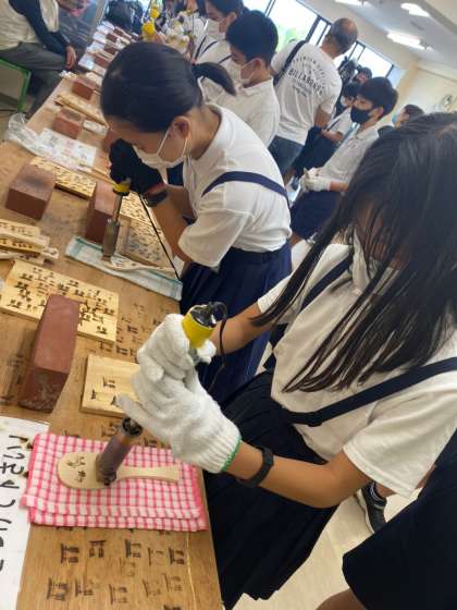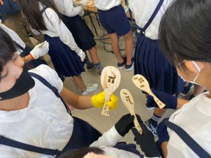 しゃもじづくりの様子です。やすりで磨いて、焼きごてで自分の好きな絵を焼印しました。どんなしゃもじがお土産になるか楽しみにしていてください。
