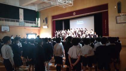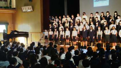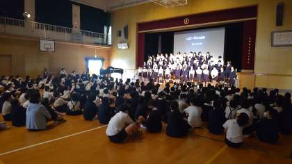 6年生が修学旅行の報告もかねて平和学習で学び、全校に伝えたいことを発表しました。修学旅行の様子の写真を写しながら、自分たちが学んだことを自分の言葉で伝えました。実際に広島に訪れたことで肌で感じたこと、みんなの想いのつまった千羽鶴を慰霊祭で献納したことなどをふまえて、当たり前にいつも過ごしている生活が、一瞬で奪われてしまったことで心の傷が今も癒えない人がいることも知りました。ことばだけでなく歌でも6年生は、想いを伝えてくれました。そして最後に、全校児童で、「この時代に生きて」という歌を歌いました。集会の司会をしてくれた5年生は「今日聞いたことを受け継いで来年私たちもしっかり学びたい」という気もちを伝えてくれました。平和は、自分たちっでつくっていくものであり、平和のために自分のできることを中野小学校のみんなでやっていこうと会の終わりに呼びかけました。今日は、ぜひ、子どもたちに6年生から伝えてもらったことを聞いてあげてください。