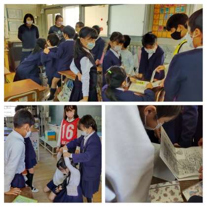 来週のたてわり遠足のために、たてわり班で集まって時計台で撮る動画や天守閣で撮る写真のポーズを班のみんなで相談して決めました。