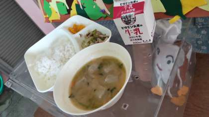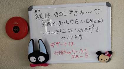 今日の給食は、豚肉とまいたけのいためもの、いわしのつみれ汁、かぼちゃのういろうでした。今日から11月。掲示も変わりました。すっかり秋ですね。