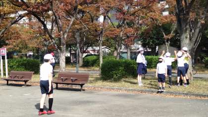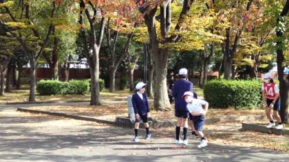 お弁当のあとは、班遊び。おにごっこやだるまさんがころんだ、落ち葉拾い等まだまだ元気な子どもたちです。