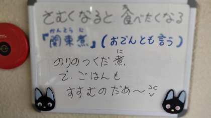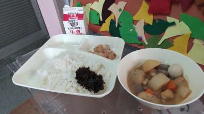 今日の給食は、関東煮(おでん)、のりの佃煮、れんこんの梅風味焼き
