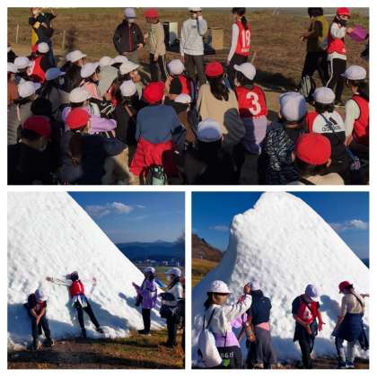 下りには人工雪がありました。グリーン広場に戻ってスポーツドリンクを飲みました。みんな揃って登山おつかれさん式です。