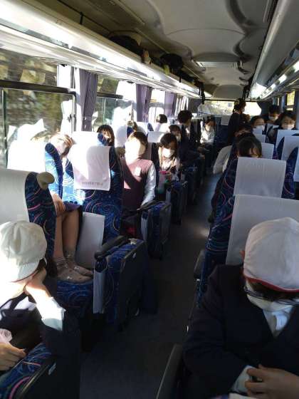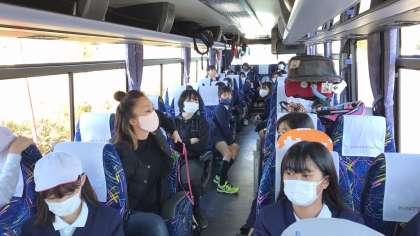 バスが出発しました。6年生です。高速にのったらバスレクの予定です。元気です!