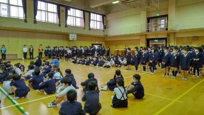 昨日の児童朝会の最後に5年生、6年生の代表の人が、1年から4年生に林間学習の間に掃除や委員会の活動を代わりにしてくれたことにお礼と林間の思い出を少し話しました。