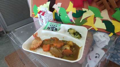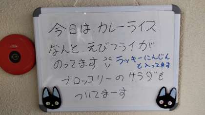 今日の給食は、エビフライカレーライス、ブロッコリーのサラダ、ソフト黒豆でした。ラッキーにんじんも入っています。あなたのカレーライスにも入っていましたか?