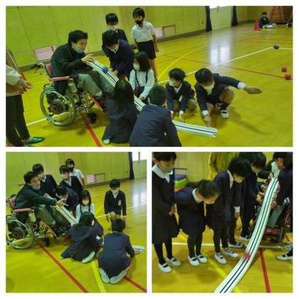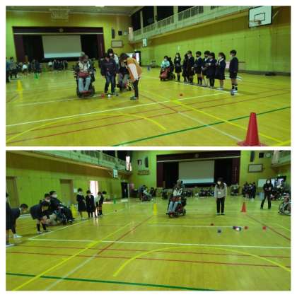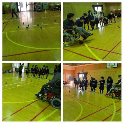 4時間目は、地域の自立生活センター あるるさんからたくさんの方が来ていただいてボッチャ体験をしました。白球に近づけるために投げ方を工夫して赤チーム青チームに分かれてゲームをしました。勾配具(ランプ)を使って顎に挟んで転がされたボールが白球に当たって近づいたときは体育館がどよめきました。みんなで楽しく活動することができました。