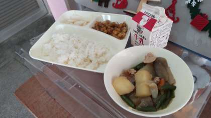今日の給食は、鶏肉と野菜の煮物、じゃこまめ、かぶの柚子風味です。じゃこまめはご飯に合います。新米で美味しかったです。