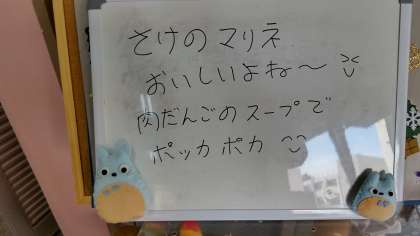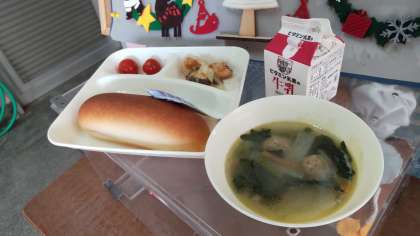 今日の給食は、さけのマリネ、肉団子と麦のスープ、プチトマトでした。スープは、暖かくて体が温まりました。さけは、からっと揚がっていておいしかったです。