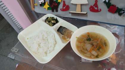 今日の給食は、鯖のみぞれがけ、すまし汁、小松菜の煮びたしでした。今日も和食でした。骨に気をつけるよう子どもたちに声かけしました。