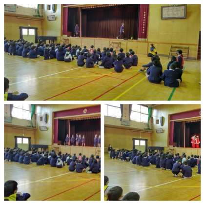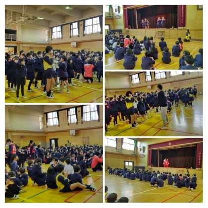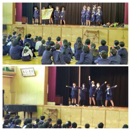 集会の後、児童会の人が、見事あいさつヒーローWeeeeeekにみんなが貯めたあいさつパワーでアイヤーンをたおすことができました。集会でもアイヤーンが倒れるようにみんなで元気なあいさつが講堂に響きました。全校で3学期も元気なあいさつをしましょう。