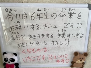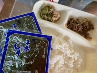 手巻きご飯(牛肉の甘辛煮、ツナソテー)、すまし汁、いちごと豪華なメニュー。のりにご飯と具を入れて巻いて食べます。