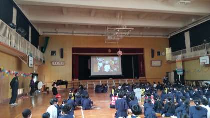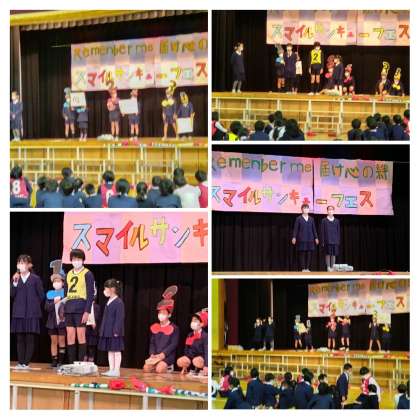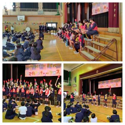 8日と9日の2日に分けて6年生の卒業を祝うサンキュースマイルフェスを講堂で行いました。初めにトーチを持って6年生が登場します。児童会の代表の人のはじめの言葉が終わったら6年生のことをもっと知ろうということで大人気の集会のワン・ツー・スリー博士によるクイズを行いました。6年生の好きな