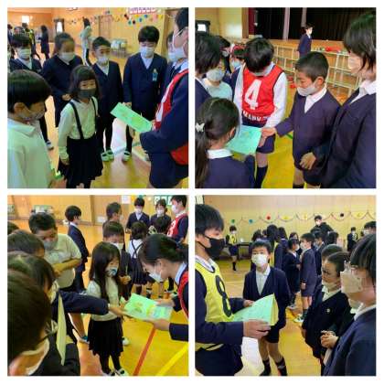 次に1年生から5年生のみんなでひまわりの約束をみんなで歌いました。間奏にそれぞれの学年でありがとうのことばを伝えました。5年生は6年生の思いを引き継いで来年のリーダーとしてがんばることを伝えました。その後6年生にそれぞれの班に来てもらってメッセージのプレゼントを渡しました。6年生は一人一人のメッセージを読んで嬉しそうでした。