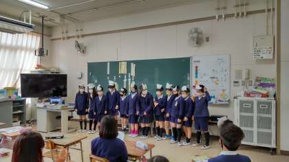 Who are you?の単元を英語劇にして各チームごとに発表しました。最初にみんなで劇の流れとせりふを確認して劇の始まりです。みんな覚えた英語を使ってそれぞれの動物を見つけていました。
