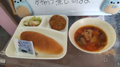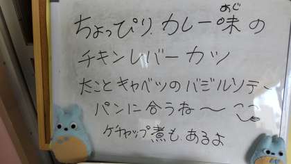 今日の給食は、チキンレバーカツ、ケチャップ煮、たことキャベツのバジルソテーでした。カレー味でくさみもなく美味しくレバーカツをいただきました。