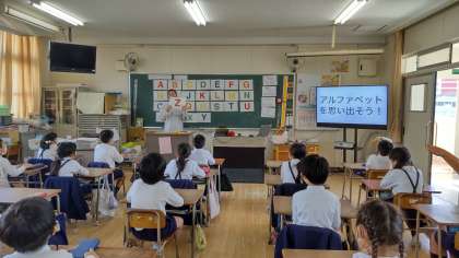 How are you? I'm happy.と友だち四人に話すゲームをしたあと、アルファベットの復習をしました。歌を歌ったり、ミッシングゲームをしたりしてアルファベットをみんなで言いました。楽しく学習できて子どもたちは大喜びでした。