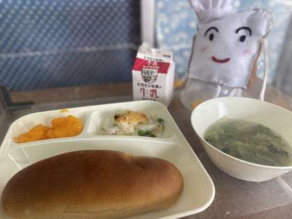 令和4年度初めての給食は、マカロニグラタン、レタスのスープ、みかん(缶)です。