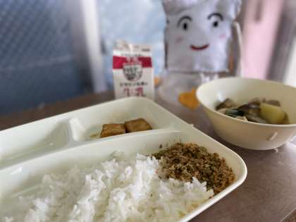 鶏肉とじゃがいもの煮もの、あつあげのしょうゆだれがけ、紅ざけそぼろです。