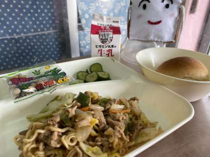 今日の給食は、焼きそば、きゅうりのしょうがづけ、豆こんぶです。