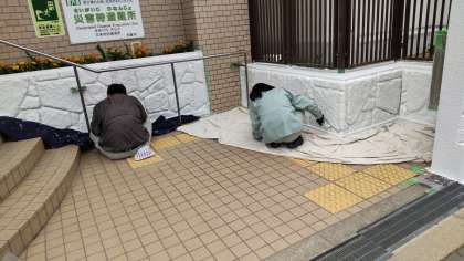 今週の始めから本校の管理作業員と営繕事務所から応援に来ていただいている管理作業員とで合同作業で壁のペンキ塗りをしていただいています。昨年鉄の部分をきれいに塗っていただいて、今年は下のコンクリートの部分を白く塗っていただいています。玄関のモチーフもきれいになりました。暑い中、作業を進めていただいてありがとうございます。