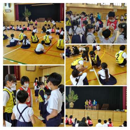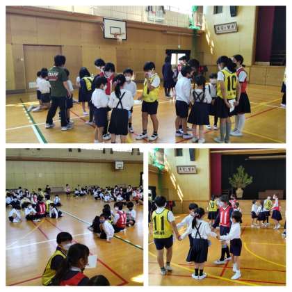 1年生と6年生がたてわり班の活動が始まる前に2学年で顔合わせをしました。お互いにつくった名刺を交換して、リーダーの名前を1年生に覚えてもらい、6年生は1年生の名前を覚える自己紹介をしました。その後、AB一緒になって、ならべならべゲームをしました。名前のあいうえお順、4月スタートの誕生日順と並んでお互いのことが知れました。終わったあと6年生に感想を聞いたら「1年生可愛かった」という声がたくさん聞かれました。1年間仲よくいっぱいお話したり、遊んだりしましょうね。あっ、忘れてはいけません。レッド、ブルー、イエローのキズナレンジャーも登場しましたね。