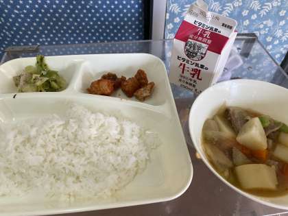 今日の給食は、まぐろのオーロラ煮、豚肉と野菜の煮もの、キャベツの赤じそあえです。