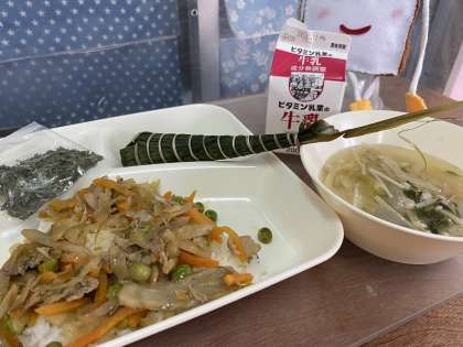 今日の給食は、きんぴらちらし、すまし汁、ちまきです。 子どもの日の行事献立です。