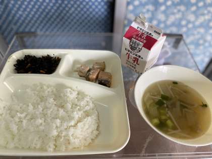 今日の給食は、さけのごまみそ焼き、五目汁、ひじきのいため煮です。