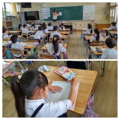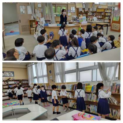 図書 今日は、図書館学校司書の川田さんに図書館での本の借り方や利用の仕方を教えてもらいました。その後、自分の読みたい本を探しました。