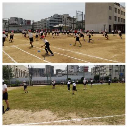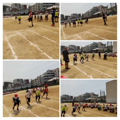 体育(中野っ子体操、バトンパス練習、ラダーとミニハードルと体をしっかり動かしてから、5・6年4チームずつ8レースリレーをしました。今まで練習してきたことを生かして最後まで一生懸命走りました。バトンパスの時も声をかけあう姿が見られ、バトンパスのときに前の走者を抜いているチームもありました。どの子も力いっぱい走る姿はかっこよかったです)