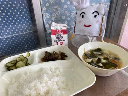 今日の給食は、プルコギ、とうふとわかめのスープ、きゅうりの甘酢づけです。