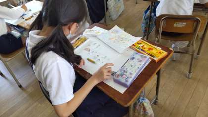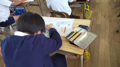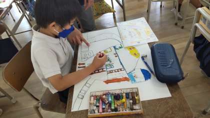 図画工作(文房具や果物などをいろいろなのりものや建物に見立てて描きました)