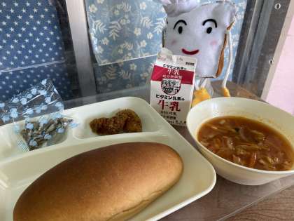 今日の給食は、一口トンカツ、ミネストローネ、ミニフィッシュです。