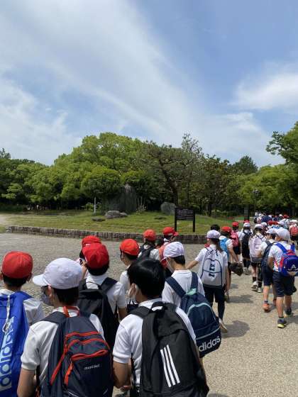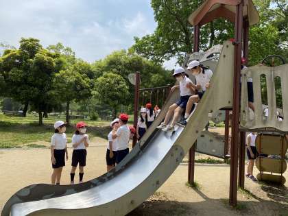大仙古墳の様子を見て、「うわぁ大きい山みたい〜」「あれがお墓なん?」と驚く子どもたち。その後、すこし遊具でも遊んでから、広い広い芝生の上で、お弁当を食べ、ドッチビーやだるまさんがころんだをしてたくさん遊びました。