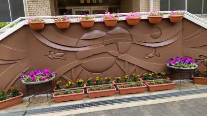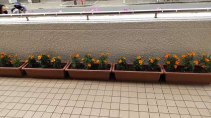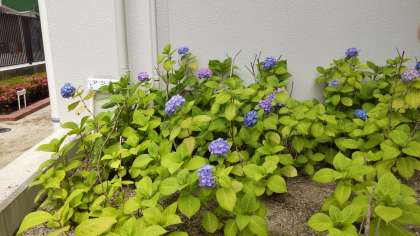 給食室前のあじさいが咲き始めています。玄関も綺麗なお花でいっぱいです。
