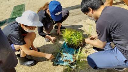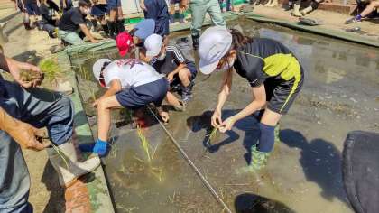中野小学校では、90周年の記念に田んぼを作っていただきました。今日は、その田んぼに稲を育てる指導に毎年お世話になっている奥田さんにゲストティーチャーに来ていただいて田植えをしました。長靴で田んぼの中を歩くとズブズブ沈んで歩きにくいことも知りました。秋にたくさん稲穂が実るように5年生みんなで育てていきます。
