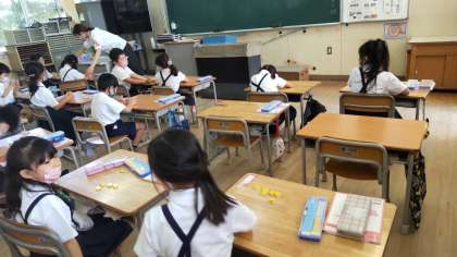 算数(6を○と○に分けて)何個か隠して机の上に残ったブロックから何個隠したか当てるゲームを隣の人としました。