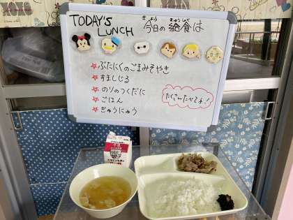 今日の給食は、豚肉のごまみそ焼き、すまし汁、のりのつくだ煮です。