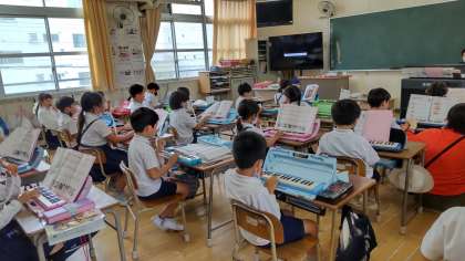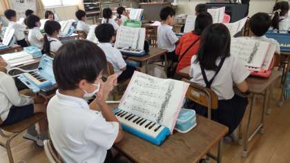 鍵盤ハーモニカで、みんなで合わせて演奏しています。友だちの音を聞いて上手にできました。新しい曲は指くぐりがあるので少し難しいですが、頑張っています。