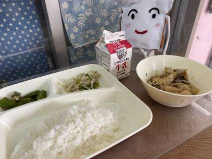 今日の給食は、すき焼き煮、オクラのかつお梅風味、もやしとピーマンのごまいためです。
