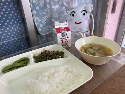 今日の給食は、チンジャオニューロウスー、ハムと野菜の中華スープ、えだまめです。