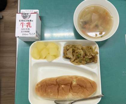 今日の給食は、カレードリア、豚肉とキャベツのスープ、りんご(缶)です。